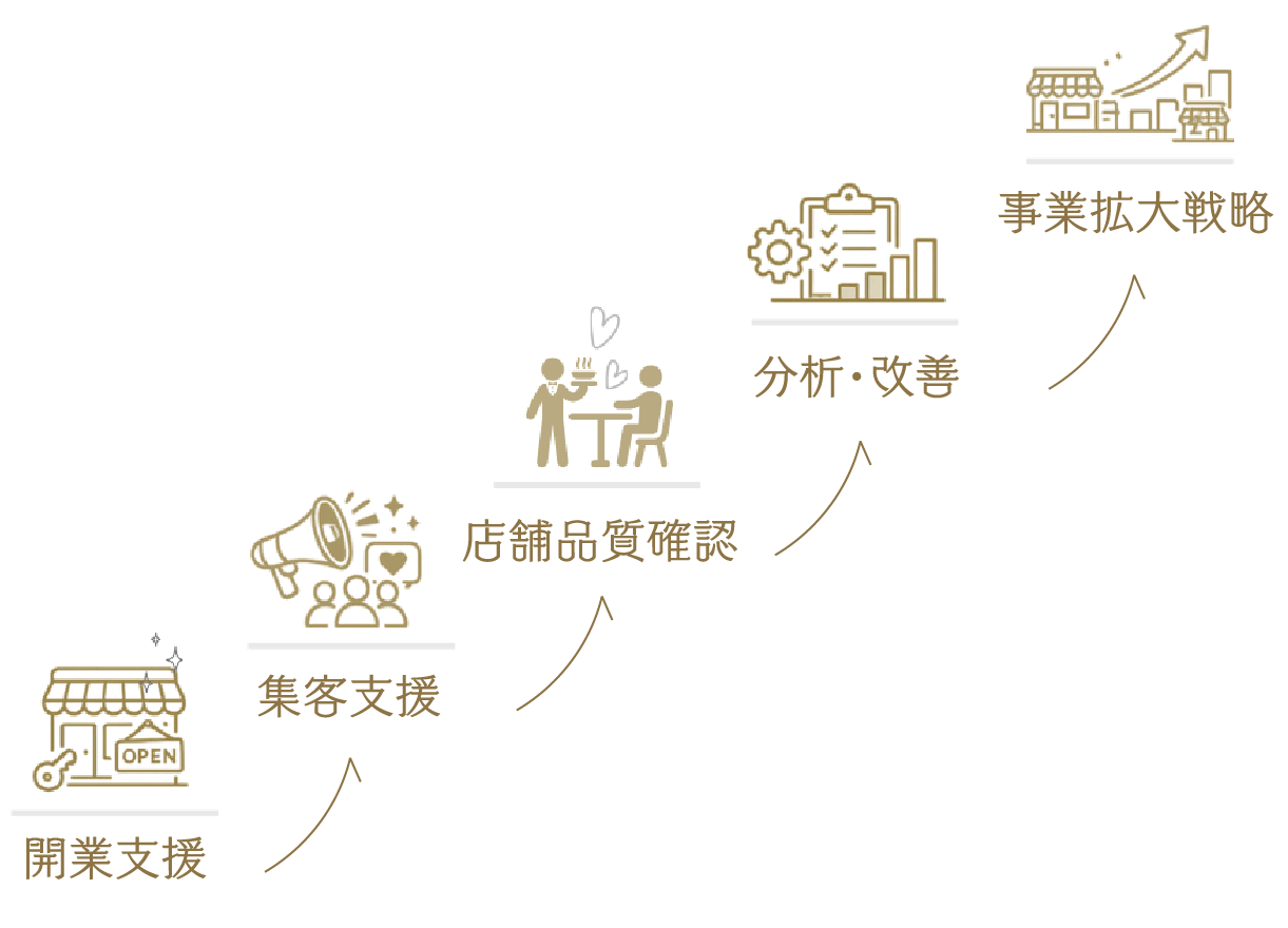 店舗ごとの課題や成長フェーズに合わせて、必要な支援を組み合わせながら、成果につながる仕組みづくりを行います。